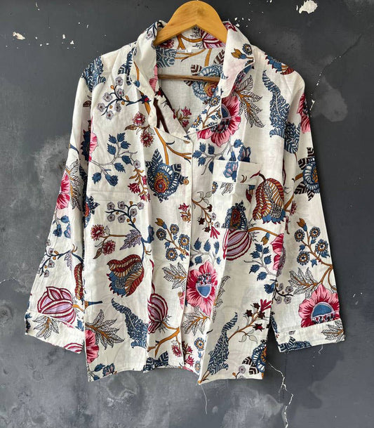 White Cotton Handmade Block Printed Pajama Set Long PJ Sets: S