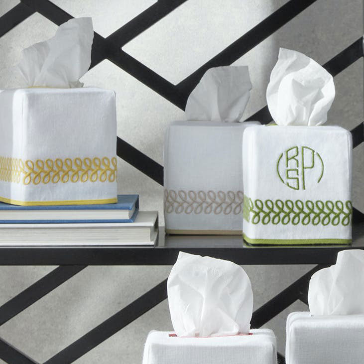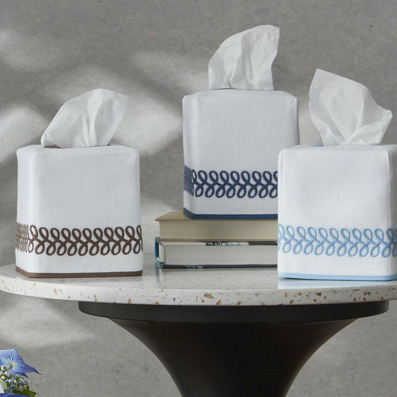 Embroidered on 100% linen, Astor Braid is a style with quintessential appeal. The bold design from Schumacher’s celebrated collection of tapes and trims is a timeless script, suited for pairing with an array of patterns. Astor Braid Tissue Box Covers feature matching tape on the opening and edge of the cover.