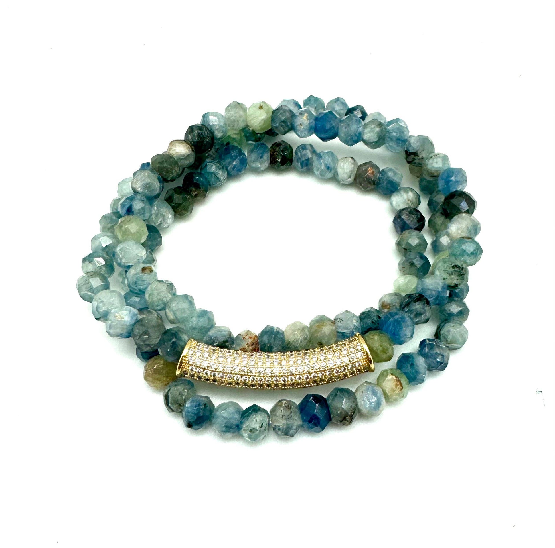 This bracelet is made on a very sturdy elastic cord and it stretches to wrap three times around your wrist. 21" Kyanite with gold tube and crystals