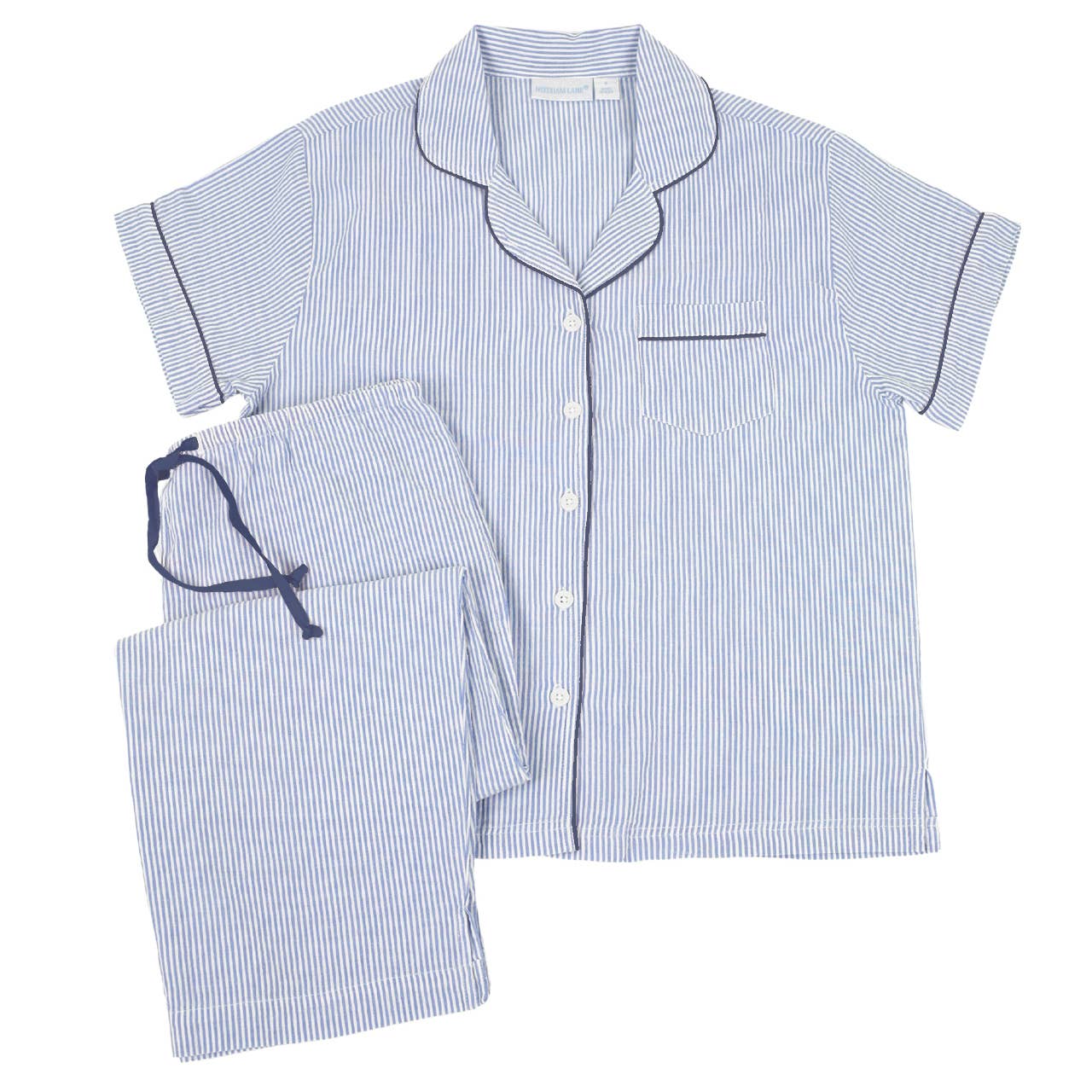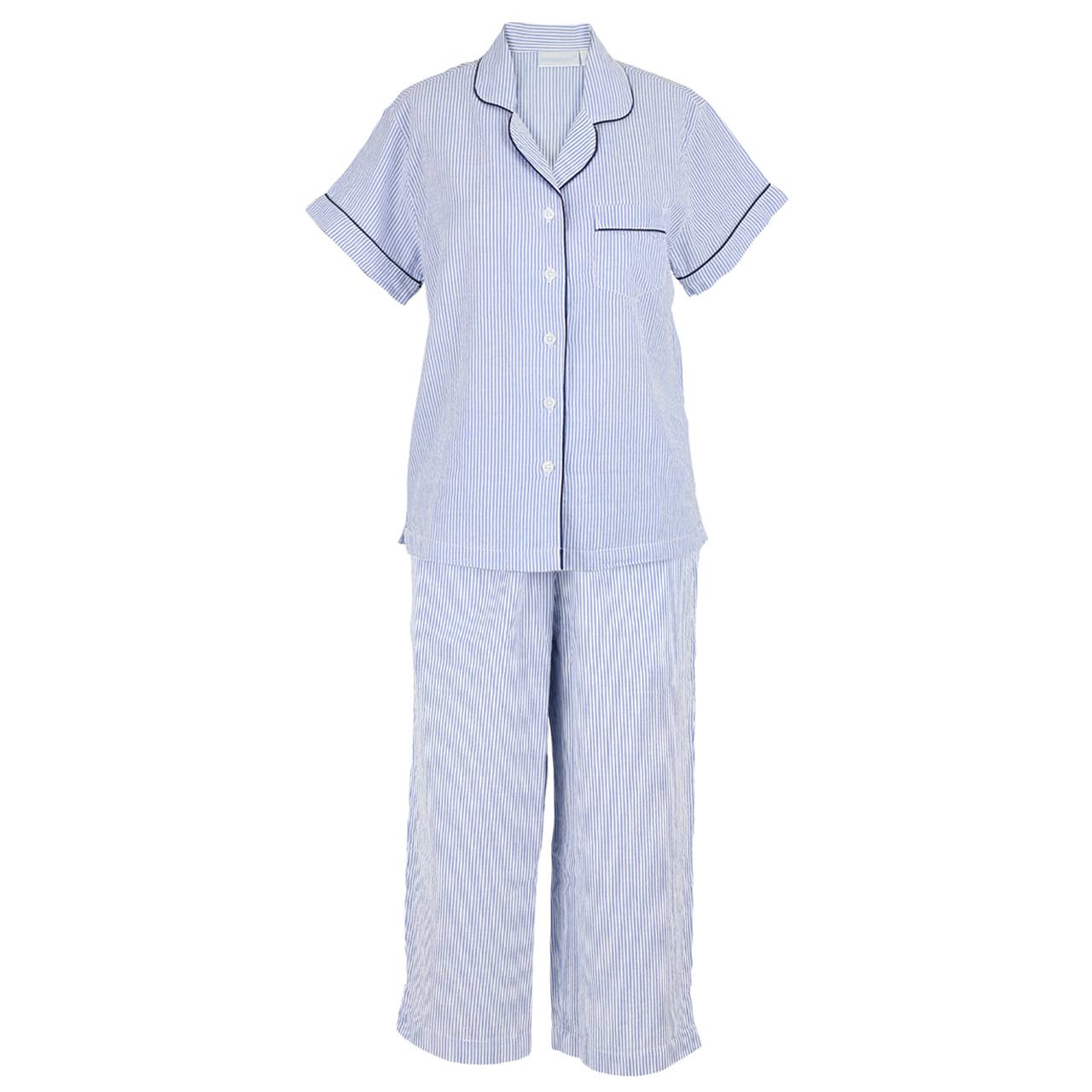 Short sleeve pajama set. Soft, 100% cotton yarn-dyed woven seersucker. Blue & white striped with navy piping and pant ties. Short sleeve button-front top with a notched collar and side slits. The capri-length pants feature side-seam pockets and elastic waistband with drawstring. Machine wash warm, tumble dry low.