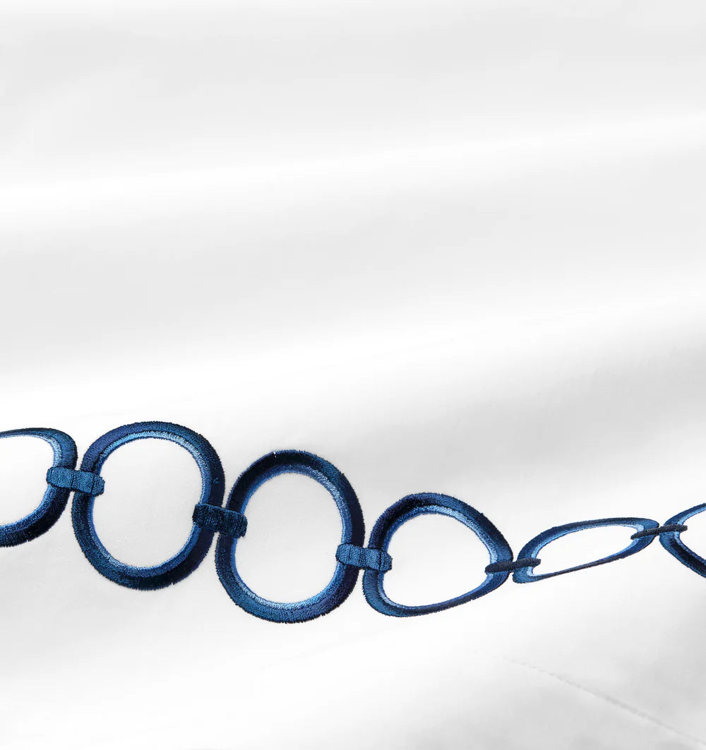 Sleek and modern, Catena’s hallmark lies in its minimalist chain motif, inspired by the timelessness of fine jewelry. Framing a canvas of pristine 100% long staple cotton white percale, the design is embroidered with immaculate precision in five distinct colorways. Each selection features a two-tone embroidery technique, creating a sense of depth.