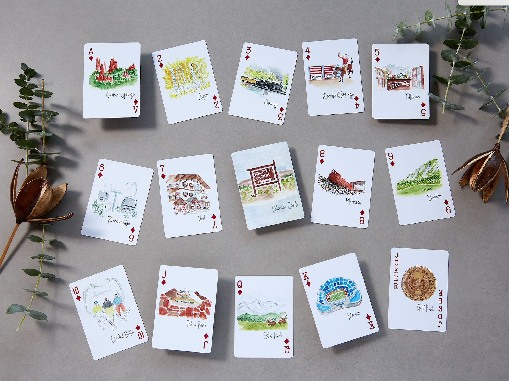 State of Colorado themed playing cards featuring 18 different unique watercolor images representing different cities and areas that make Colorado unique. Including, Colorado Springs, Aspen, Durango, Steamboat Springs, Telluride, Breckenridge, Vail, Morrison, Boulder, Crested Butte, Pikes Peak, Mesa Verde, Royal Gorge and Sand Dunes, Estes Park, Denver, the Gold Rush and Coors.