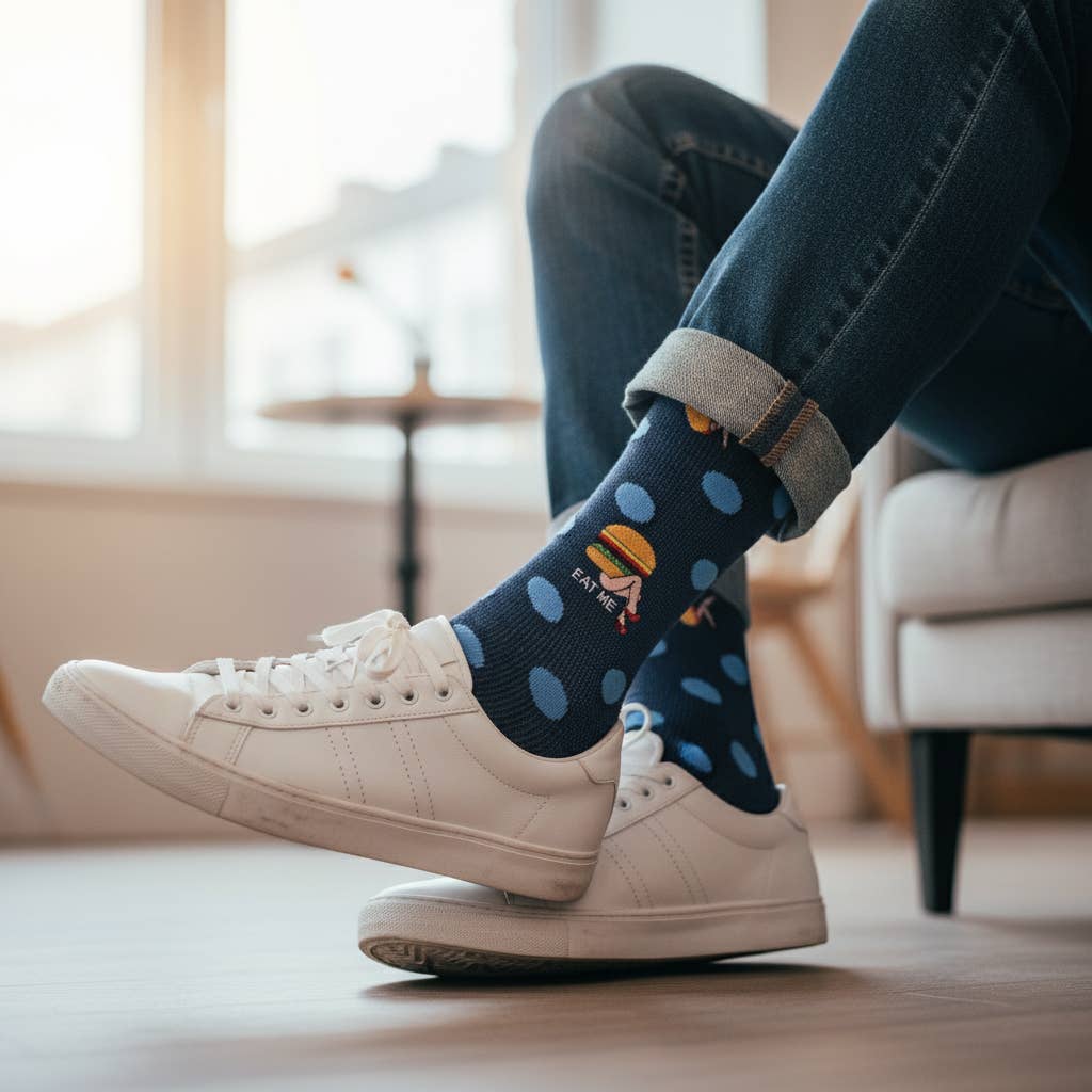 These textured blue polka dot Pima cotton men's socks feature a slightly scandalous embroidered hotdog and hamburger duo, fashioned after vintage fast food adverts. Finished with wide ribbed cuffs and extra stretch for comfort. Truly gift-worthy, these socks stand out on display!