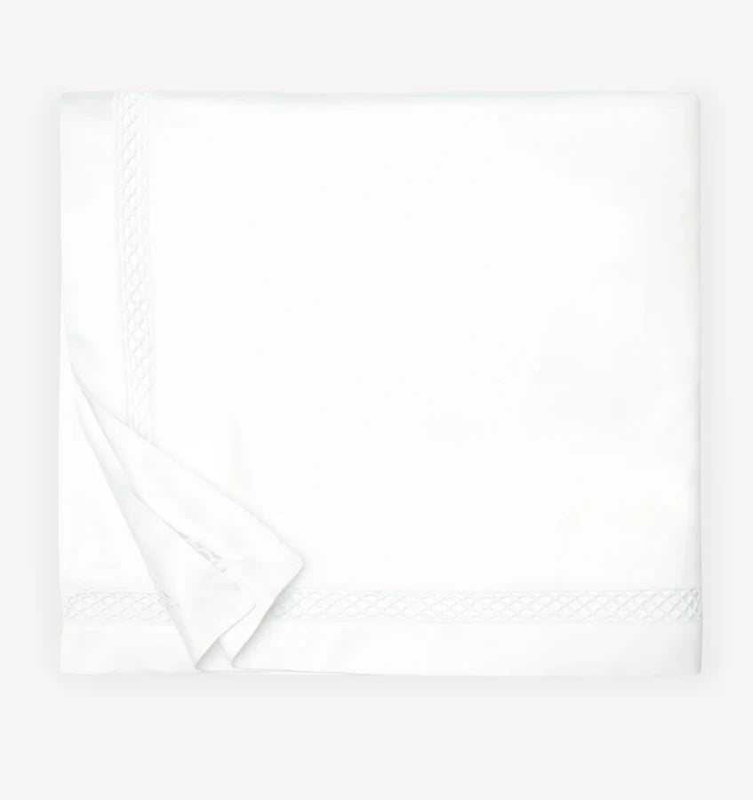 Shortened-flanges, approximate measurements: Duvet Cover: 2.5 inches, including lace; Shams: 2-inches, including lace; Boudoir: 2-inches, including lace; Flat Sheet and Pillowcases: 3.5-inches, including lace; lace inset is on body of sheet and case, not included in cuff