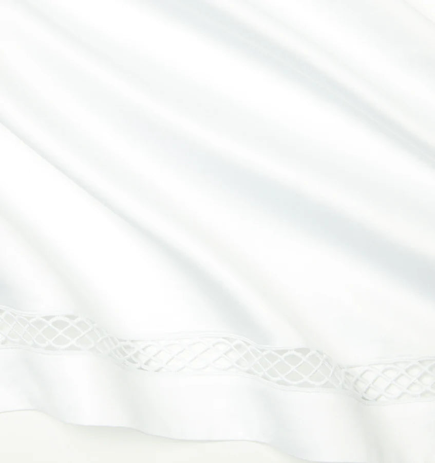 Shortened-flanges, approximate measurements: Duvet Cover: 2.5 inches, including lace; Shams: 2-inches, including lace; Boudoir: 2-inches, including lace; Flat Sheet and Pillowcases: 3.5-inches, including lace; lace inset is on body of sheet and case, not included in cuff